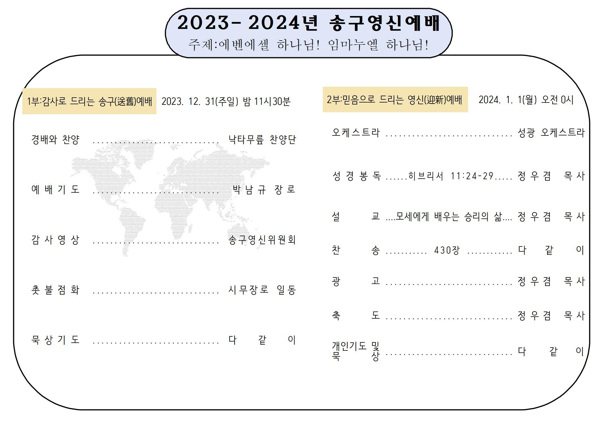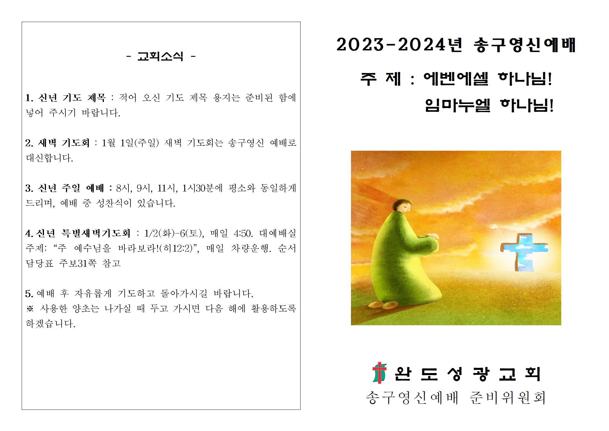 - 7324년 12월31일 송구영신예배 순서지2023년 12월 30일550