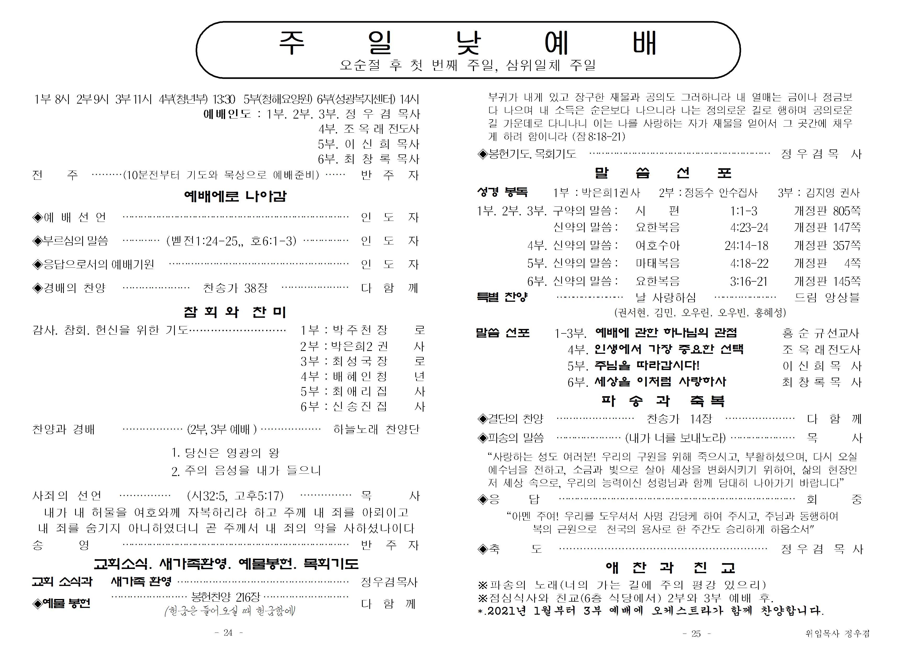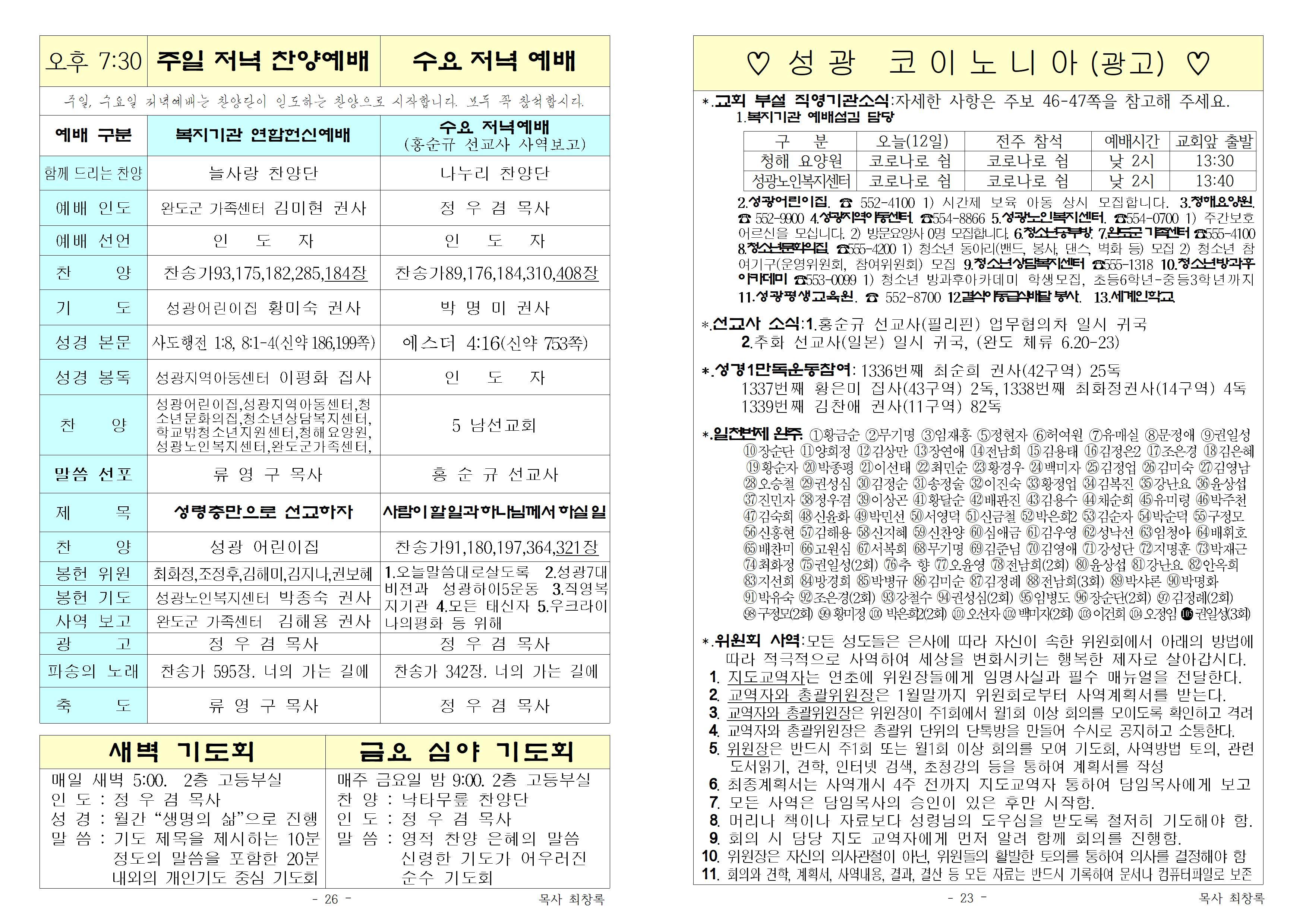 2.주일애찬위원회:다음주(19일)애찬담당:2교구.문의:배판진권사(010-4627-0363)